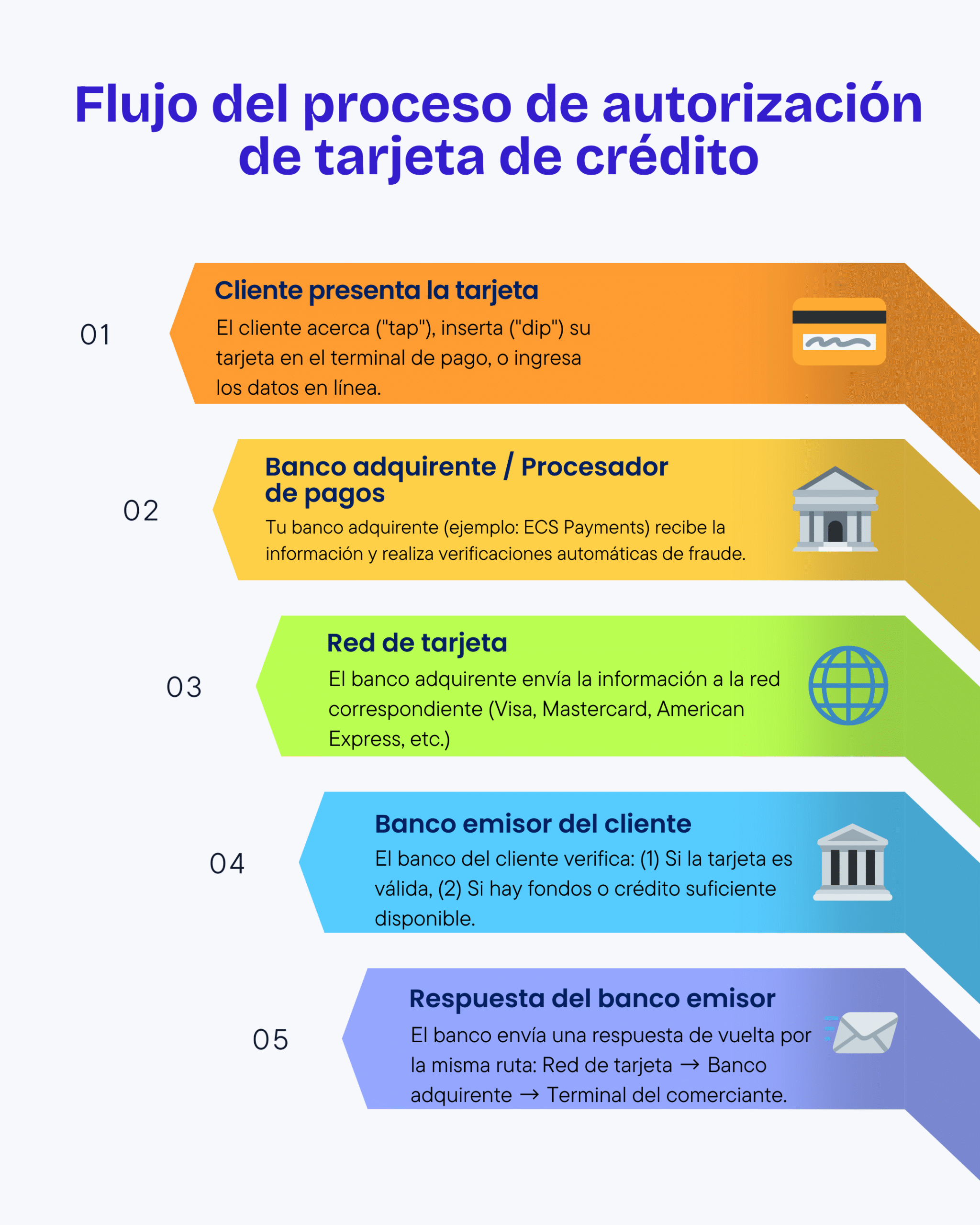 La autorización de tarjeta ocurre cuando el banco emisor del cliente transmite una confirmación de que la tarjeta tiene fondos suficientes o un límite de crédito disponible para cubrir la compra pendiente. El banco emisor es la institución financiera donde el cliente realiza sus transacciones bancarias y que le emite la tarjeta. Los emisores son distintos de las redes de tarjetas como Visa, Mastercard o American Express.